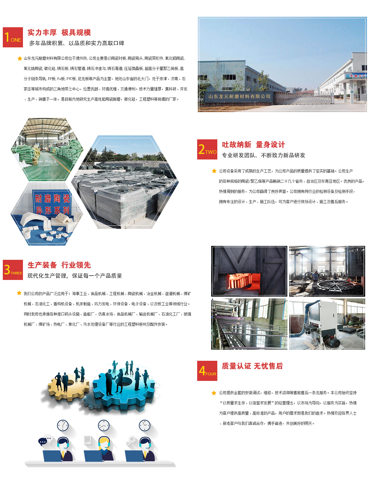 山東龍元耐磨材料有限公司位于德州市,公司主要是以鑄石板、氧化鋁陶瓷、三合一陶瓷復合襯板、陶瓷復合板、碳化硅、壓延微晶板、鑄石沖渣溝、氧化鋁陶瓷管道、氧化鋁陶瓷彎頭、三合一復合陶瓷板、鑄石管道、鑄石彎頭、氧化鋁陶瓷片、超高分子量聚乙烯板、三合一復合陶瓷板等產品為主營,地處山東省的北大門,處于京津、濟南、石家莊等城市構成的三角地帶之中心,位置優越、環境優雅、交通便利。技術力量雄厚,集科研、開發、生產、銷售于一體,是目前內地研究生產高性能陶瓷耐磨,碳化硅,工程塑料等規模大的廠家之一。公司設備采用了成熟的生產工藝,為公司產品的質量提供了堅實的基礎。